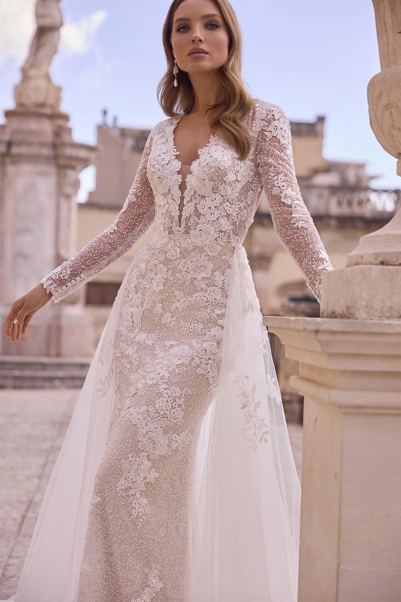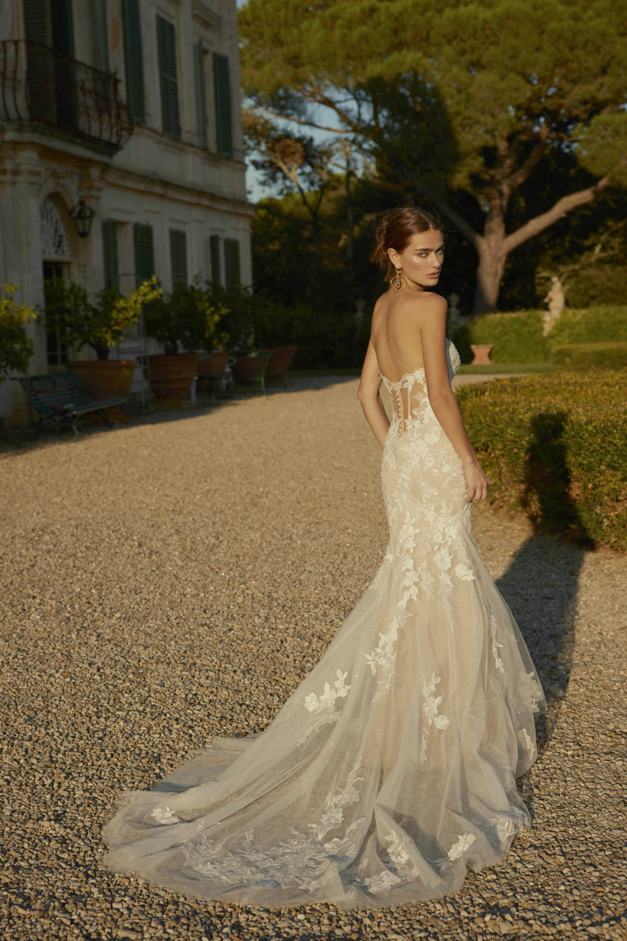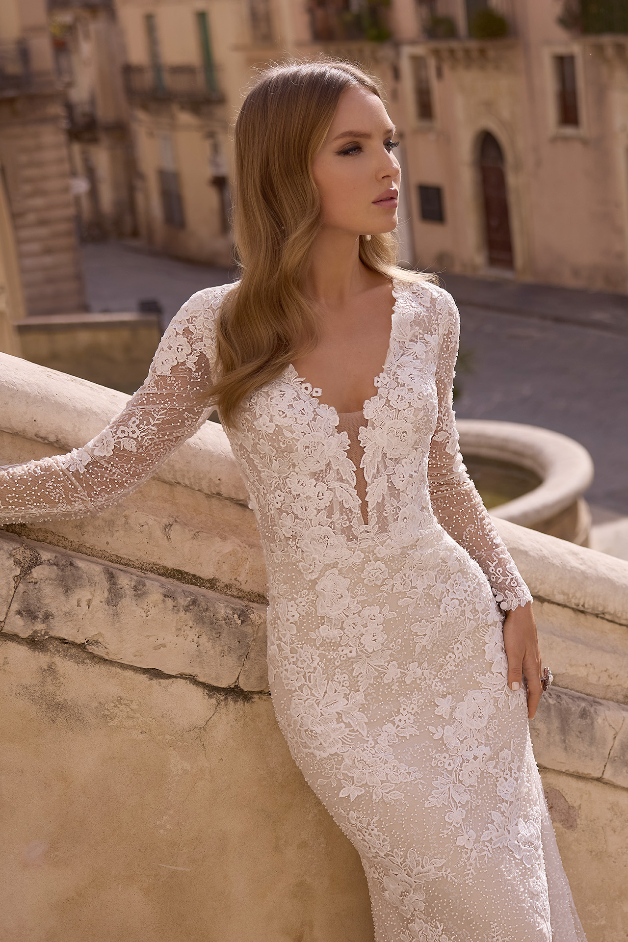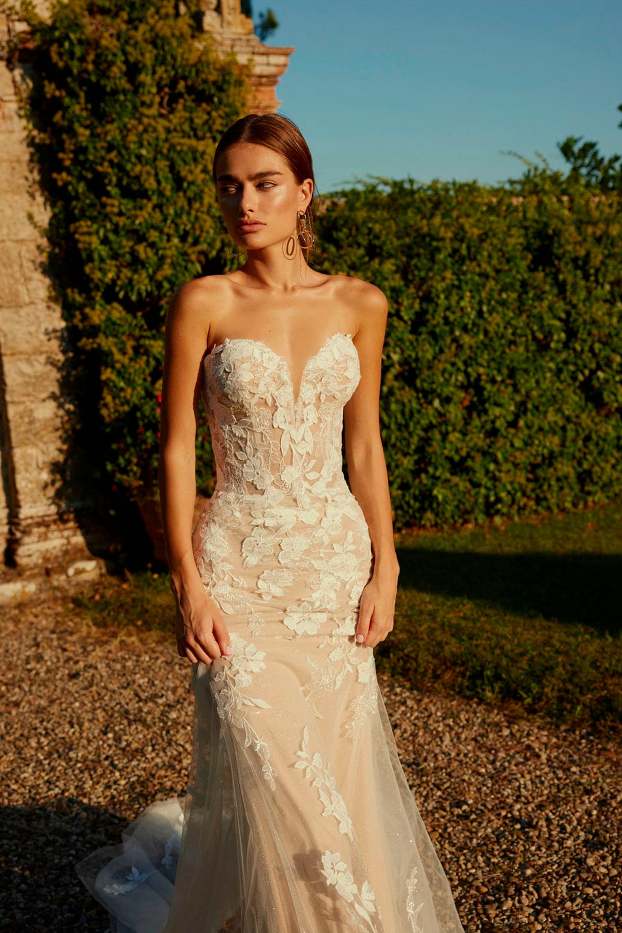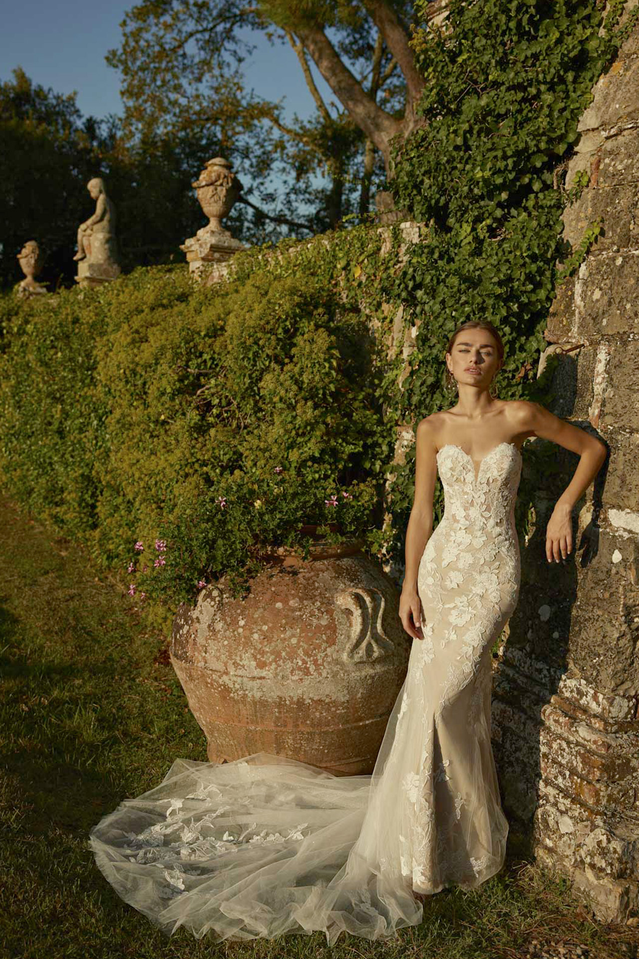 Gli abiti da sposa sirena sono noti per la loro silhouette affascinante e sensuale. Questi abiti sono caratterizzati da una gonna aderente che si allarga dalla metà della coscia o dal ginocchio, creando un effetto a “sirena” che accentua le curve del corpo in modo elegante. Questa silhouette è la scelta perfetta per le spose che desiderano un look sofisticato e seducente, senza rinunciare all’eleganza e al glamour.
